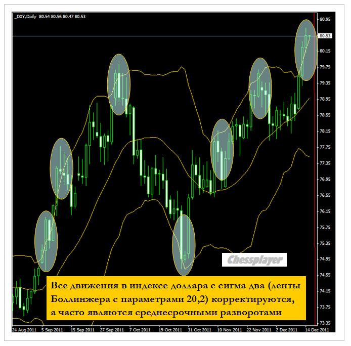 Но в ближайшие два-три дня, по крайней мере, до понедельника, я ожидаю отскока и образования некоторого волатильного боковика по евро примерно с диапазоном 1,294-1,315. Это связано с высокой перепроданностью и на дневных графиках индекса доллара с наложенными лентами Боллинджера хорошо видно, что все движения с сигма больше двух затем подвергались коррекции.