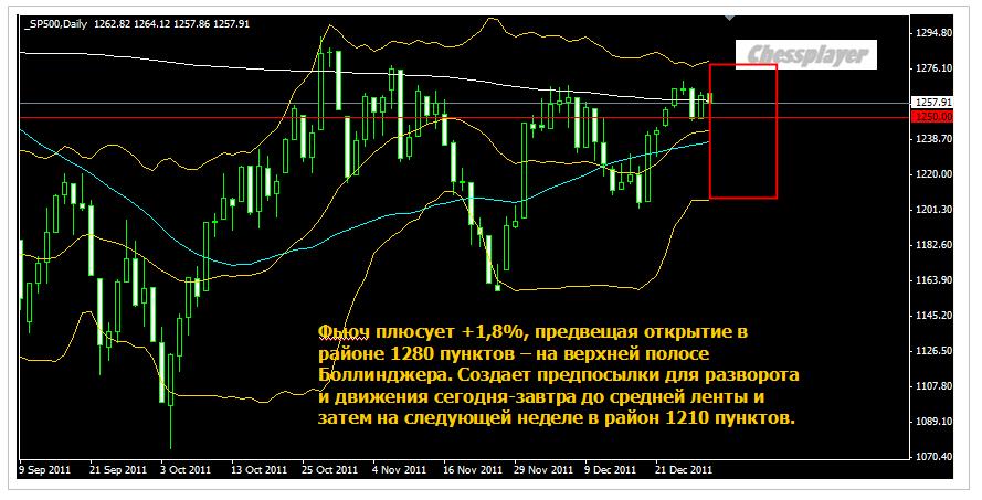 Фьюч плюсует +1,8%, предвещая открытие в районе 1280 пунктов – на верхней полосе Боллинджера. Это создаст прекрасные предпосылки для разворота (модель Уупс по терминологии Ларри Вильямса), формирования трендового дня вниз и движения сегодня-завтра до средней ленты (1243 пункта) и затем на следующей неделе в район 1210 пунктов.