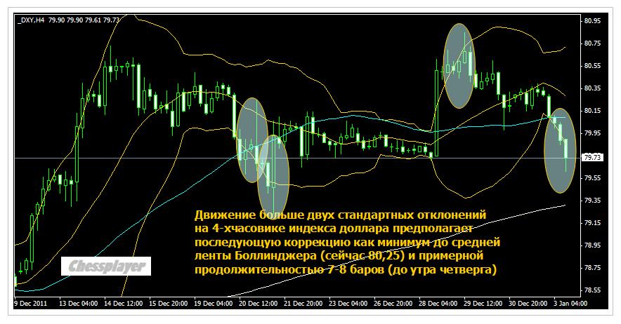 Движение больше двух стандартных отклонений на 4-хчасовике индекса доллара предполагает последующую коррекцию как минимум до средней ленты Боллинджера (сейчас 80,25) и примерной продолжительностью 7-8 баров (до утра четверга). Таковы "привычки" плеймейкеров.