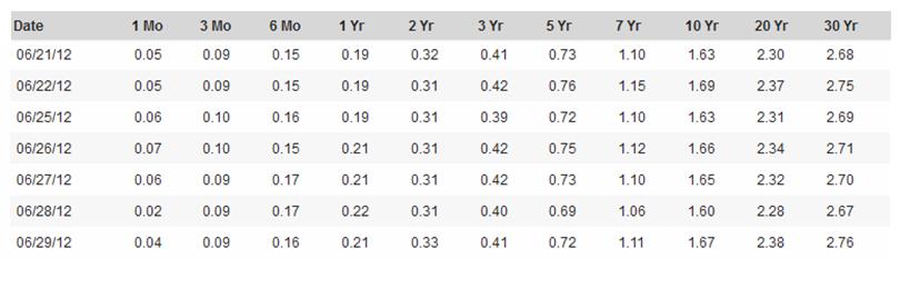 Внизу кривая доходности US Treasuries в табличной форме за тот период