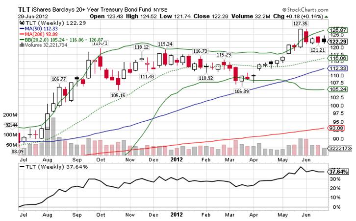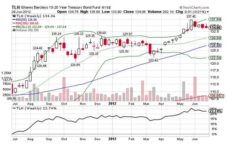 Если посмотреть на то, как изменялись графики TLH ( ETF-фонд US Treasuries со сроками погашения свыше 10 лет) и TLT ( ETF-фонд US Treasuries со сроками погашения свыше 20 лет), то мы увидим, что Банку России следовало в период с июля 2011 по июнь 2012 года иметь в своем портфеле более длинные американские казначейские бумаги.