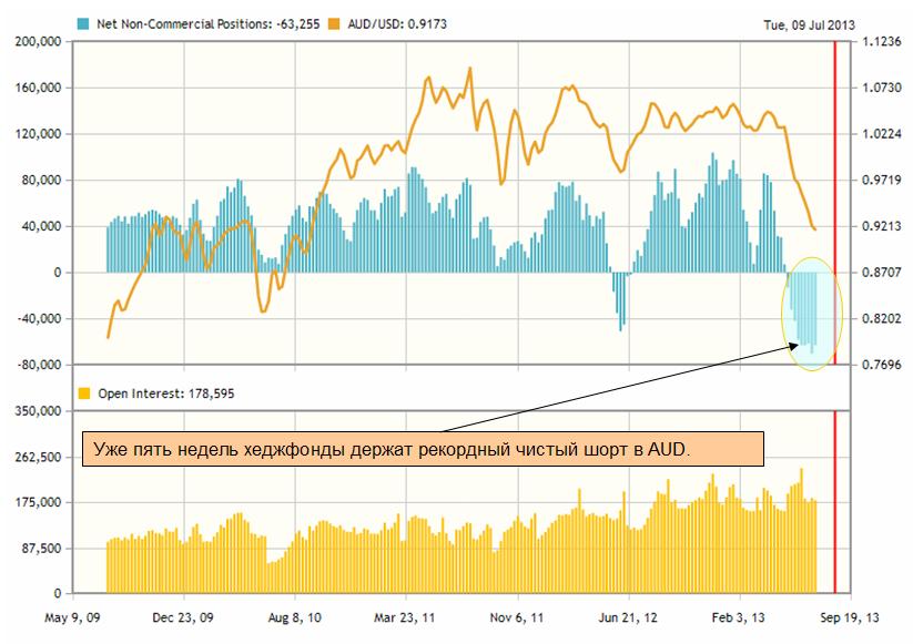 Хотя неделя перед последним отчетом ознаменована тем, что чистый шорт некоммерческих трейдеров впервые существенно уменьшился: с 70515 до 63255 контрактов. Один контракт соответствует 100000 долларов. Следовательно некоммерческие трейдеры, а большая их часть – хеджфонды, стоят в шорт по AUD на 6,3 млрд. долларов.