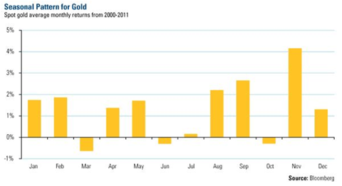 Нашел интересный график сезонности золота. Может кому будет интересно. Данные из блумберг до 2011 года.