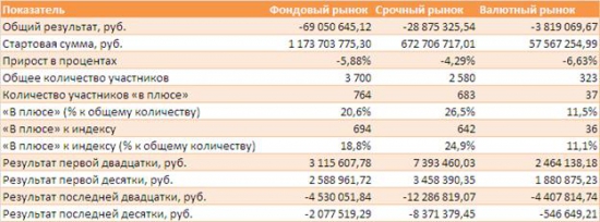 Худший результат в процентах у спекулянтов на валютном рынке, а в абсолюте у тех, кто играл на фондовом рынке. При этом наиболее заметно пострадала «последняя двадцатка» игроков на срочном рынке. Справедливости ради надо отметить, что максимальный в абсолюте выигрыш тоже приходится на первую двадцатку игроков срочного рынка. Здесь же максимальное число игроков оставшихся «в плюсе» несмотря на отрицательное математическое ожидание этого рынка.