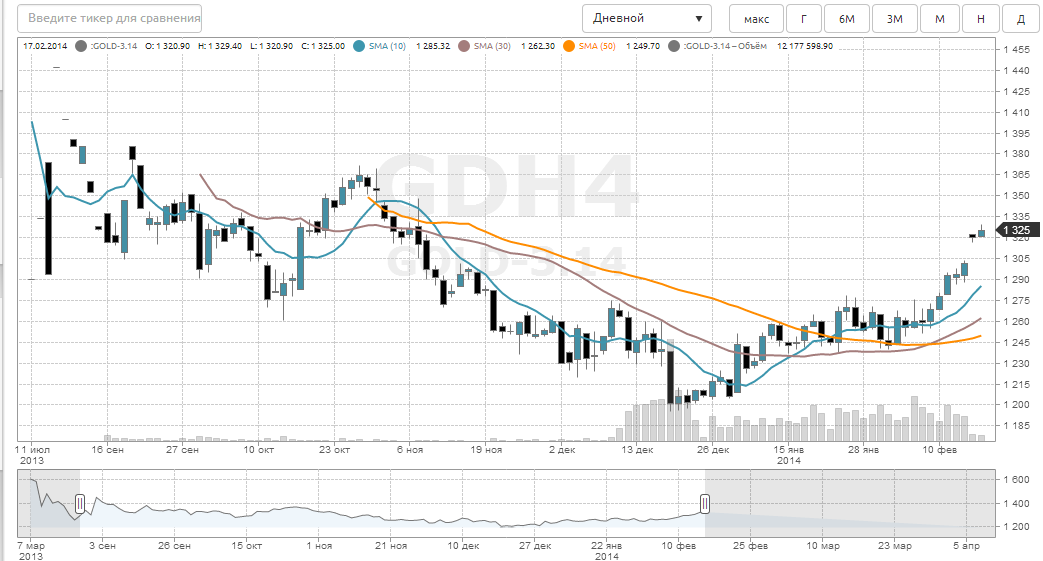 Золото растет, пробивая максимумы за последние три месяца. Основная причина — золотой металл становится снова популярен среди инвесторов как защитный актив. Серебро активно догоняет золото по динамике роста. На прошлой неделе золото выросло на +4,1%. Инвесторы предполагают замедление роста экономики США. Производство в США снизилось неожиданно в январе наибольшими темпами с мая 2009 года. Крупнейшие хэдж-фонды увеличивают свои вложения в золоте. Легендарный управляющий Джон Полсен держит крупную позицию по золоту вот уже четвертый квартал. После рекордного падения в 2013 году золото снова пользуется популярностью. На российском рынке ближайший фьючерс на золото Gold-3.14 выглядит привлекательно для покупок.