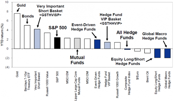 В аутсайдерах находятся хэдж-фонды. Причем различные стратегии хэдж-фондов показывают посредственный результат, от классических long/short до фондов на основе фундаментального анализа. Хотя есть стратегии ориентированные на события, которые неплохо себя проявили. Во главе доходности стоит золото с доходностью почти 8%. Далее идут облигации. Хороший результат показала стратегия коротких продаж. Большинство стратегий проиграло широкому рынку S&P500. По инерции акции Russel 1000 обгоняют акции широкого рынка. Общая динамика всех типов хэдж-фондов показывает небольшой минус. В целом, хэдж-фонды пострадали от вложения в потребительский сектор, который показывает наихудшую динамику среди секторов экономики. А наилучший сектор Utilities вообще почти не представлен в портфелях хэдж-фондов. О чем это нам говорит?