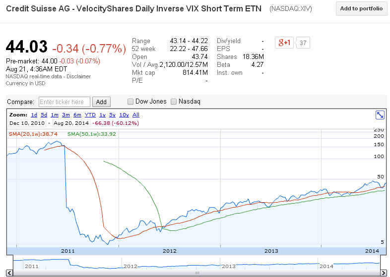Этот индекс показывает волатильность широкого рынка S&P500. Волатильность находится на исторических минимумах. После всплеска в 2008 году до 80 пунктов волатильнотсь снижается благодаря титанической работе ФРС США. Индекс еще называют “индексом страха”, так как он отображает хорошо коррекции и падения на рынке. Логично предположить, что такое поведение волатильности напрямую связано с огромными вливаниями ликвидности Центробанком. И вот в ФРС заявляют о скором завершении праздника оптимизма. А инвесторы спокойны. Почему? Видимо их успокаивает другой график. Это ETF (XIV) привлекает все больше внимание инвесторов, которые покупают его. Он идет противоположно индексу VIX и отражает уверенность инвесторов, что волатильность будет низкая и стабильная.