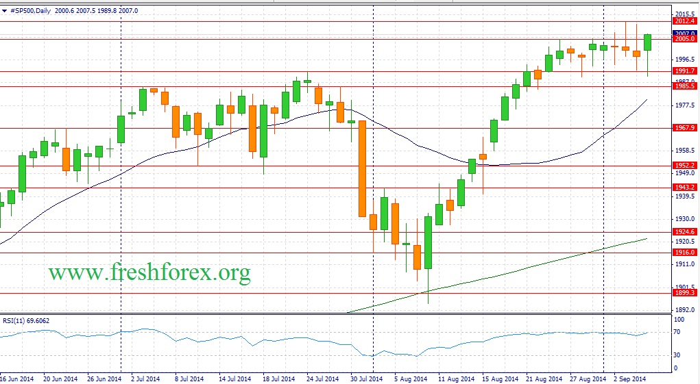 Фьючерсный контракт на фондовый индекс S&P500 вновь установил свежий исторический максимум! Рост индексов ISM производственного сектора и сферы услуг в Соединенных Штатах в августе указывают на увеличение темпов экономического роста, что является позитивным фактором для фондового рынка. Даже выход показатель Non-Farm хуже медианы прогнозов не испортил настроения быкам – после небольшого снижения котировок в область 1989.8 восходящее движение продолжилось и на этом позитивном фоне торги завершились ростом котировок на 0.32%, на отметке 2007.