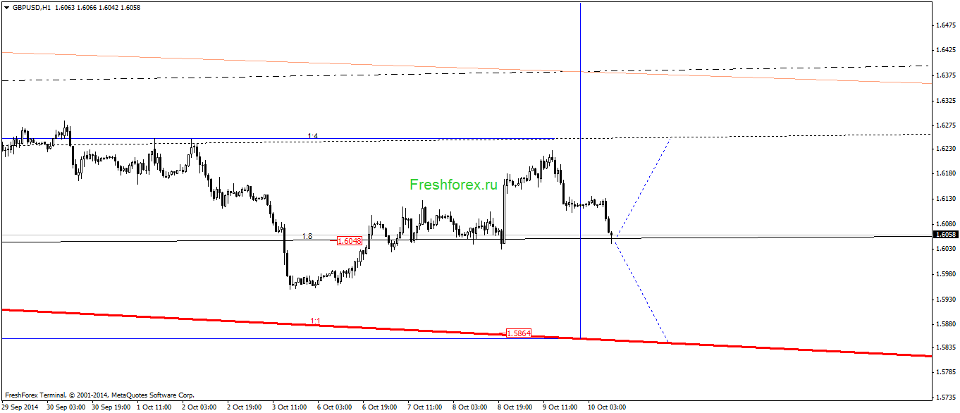 GBPUSD Н1. Цена опять тестирует угол 1:8. Если угол будет пробит вниз, то целью становится угол 1:1 на уровне 1.5844. Если цена не сможет преодолеть отметку 1.6050, то пойдём на обновление максимума этой недели к углу 1:4.