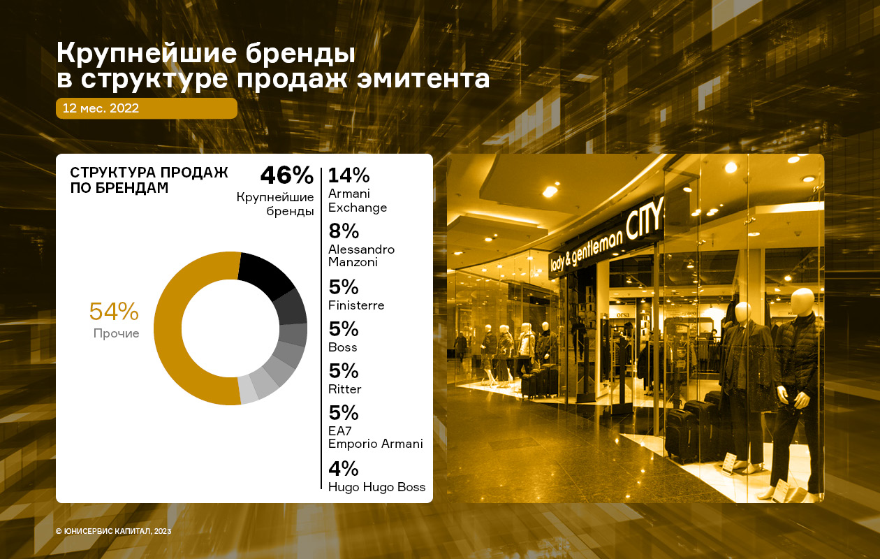 Ассортимент модной сети магазинов lady & gentleman CITY формируют коллекции европейских модных домов, интерес к которым со стороны покупателей неизменно растёт. В сети представлено более 30-ти ключевых брендов. Крупнейшим брендом продолжает оставаться Armani Exchange, который занимает около 14% в структуре продаж эмитента за 12 мес. 2022 г.