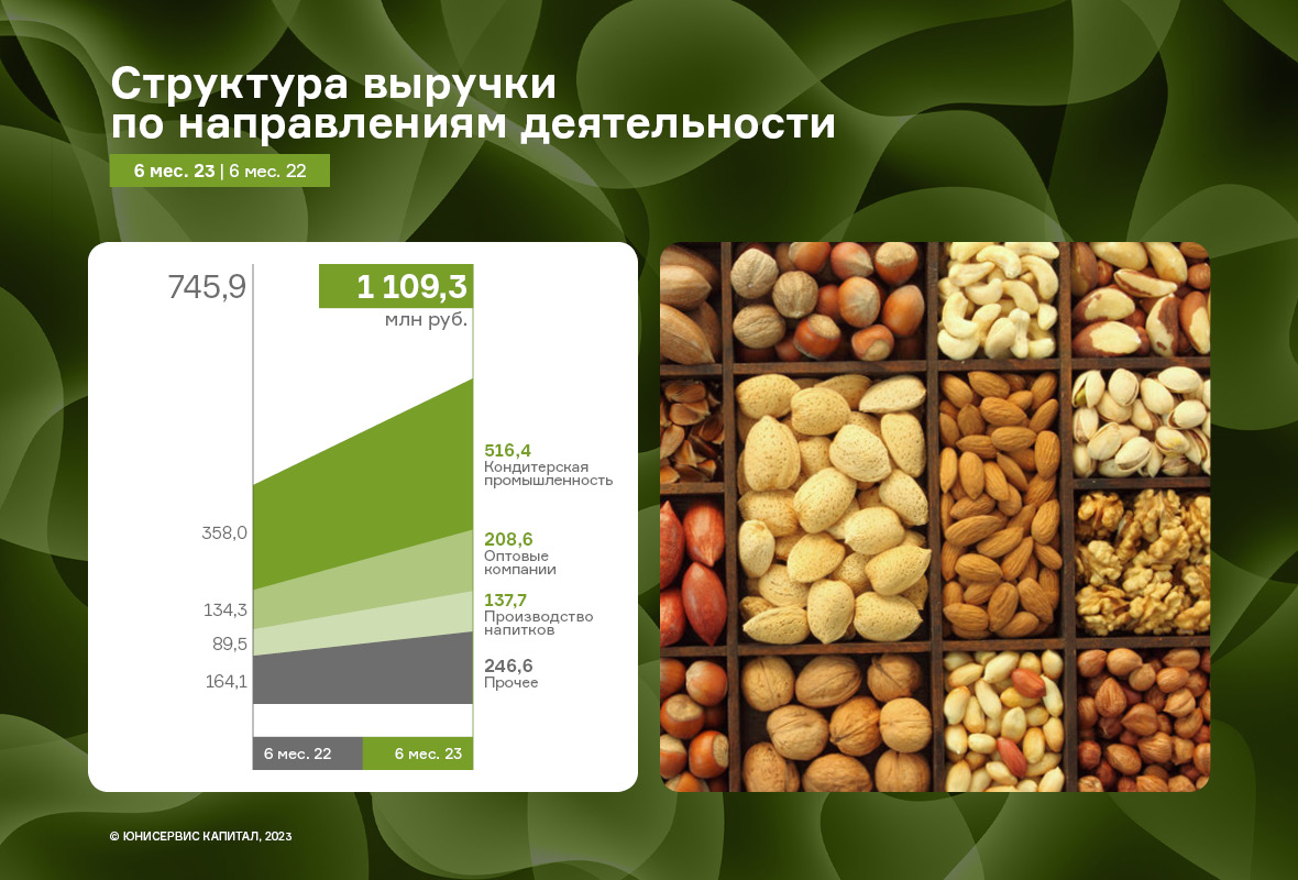 При этом, ключевым направлением является на сегодня сотрудничество с предприятиями кондитерской промышленности. Его доля в структуре выручки на 30.06.2023 г. — 46%.