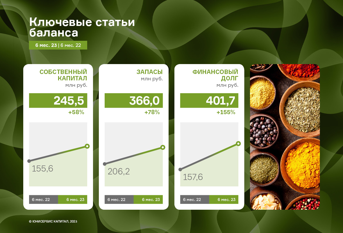 Все заемные ресурсы были направлены на пополнение оборотных средств, в первую очередь запасов, размер которых на 30.06.2023 г. составил 366,0 млн руб., что выше значения на 30.06.2022 г. на 77,5%. Запасы какао-порошка, лимонной кислоты, кокосовой стружки, пищевых ароматизаторов и прочих ингредиентов составляют 52,9% активов баланса.