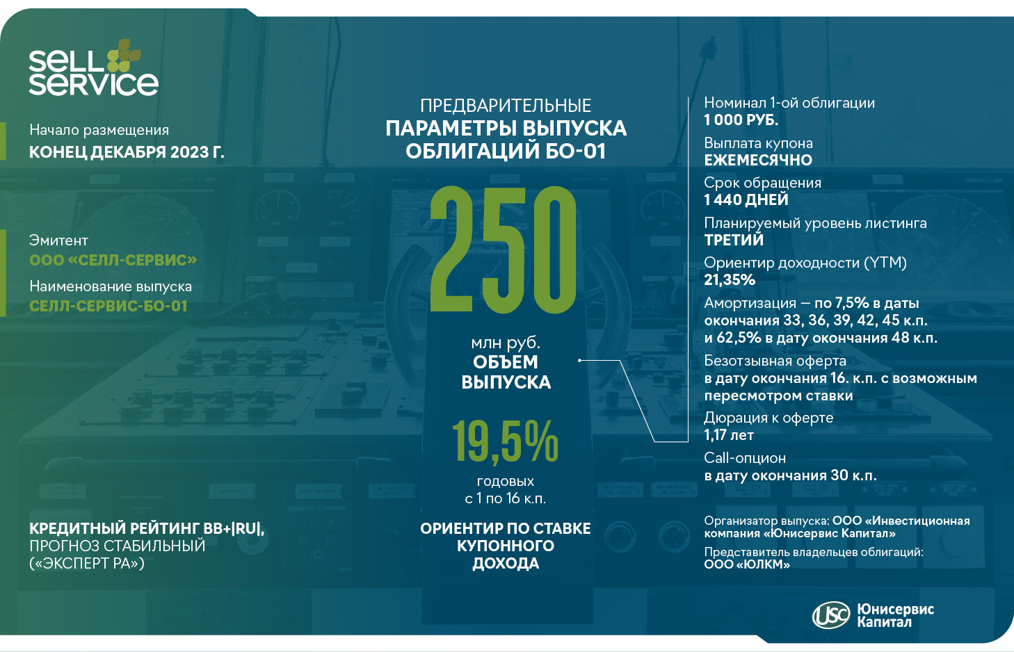 По готовящемуся к размещению выпуску серии СЕЛЛ-Сервис-БО-01 эмитент сообщил предварительные параметры: объем — 250 млн руб., ориентир ставки купонного дохода — 19,5% годовых с 1 по 16 купонный период, далее безотзывная оферта с возможным пересмотром ставки. Ориентир доходности (YTM) — 21,35%, дюрация к оферте — 1,17 лет. Номинал одной бумаги — 1 000 руб., ежемесячные выплаты купонного дохода, срок обращения — 4 года или 1 440 дней. По выпуску планируется предусмотреть частичное досрочное погашение по 7,5% от номинала в даты окончания 33, 36, 39, 42 и 45 к.п. и 62,5% в дату окончания 48 к.п., а также возможность досрочного погашения выпуска в дату окончания 30 к.п.