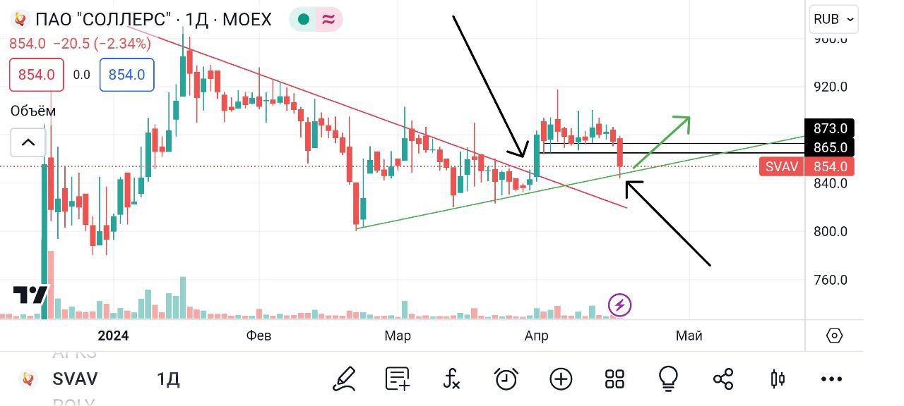 🥜Красную контртрендовую бумага ранее пробила, т.е. вышла из низходящей тенденции. Сейчас образовалась локальная трендовая, её сейчас оттестировали, положительная реакция на неё присутствует!
