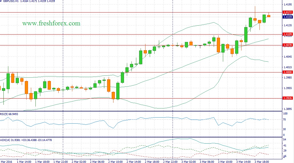 Фунт стрелингов изо всех сил рвется наверх, однако негативный фундаментальный фон сигнализирует о том, что в самое ближайшее время нас вновь ожидает развитие нисходящего тренда. Все три отчета, которые Markit опубликовал на этой неделе по Великобритании, огорчили инвесторов слабыми данными. В первую очередь следует выделить релиз по сфере услуг – показатель PMI в феврале упал до минимального уровня с марта 2013 года. Именно этот сектор в последнее время был локомотивом роста экономики Соединенного Королевства и если здесь начинается замедление роста, то в скором времени начнутся сбываться самые мрачные прогнозы в отношении британской валюты. Нельзя обойти стороной и динамику рынка “черного золота”. С одной стороны, высокий рост запасов сырой нефти в США за минувшую неделю (10,3 млн. баррелей) ограничивает рост котировок энергоносителей. С другой стороны, несмотря на такие слабые данные, мы не увидели распродаж на рынке, что сигнализирует о наличии большого числа покупателей. В этой связи, можно сделать вывод, что нефть марки Brent, с которой тесно коррелирует британская валюта, будет некоторое время находиться в консолидации 35,90 -37,90 $/баррель, пока на рынке не появятся новые драйверы для роста котировок. Этот фактор в свою очередь также лишает “быков” краткосрочных козырей. Нельзя обойти стороной и негативную динамику долгового рынка: дифференциал доходности государственных облигаций США и Великобритании расширяется, что увеличивает привлекательность инвестиций в американские активы. На этом фоне, в течение дня следует открывать позиции Sell на росте котировок в область 1.4210/1.4250 и фиксировать прибыль на отметке 1.4110.