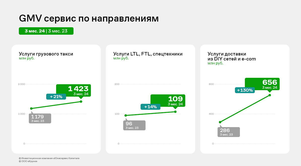 GMV в 1 квартале 2024 года прирос к АППГ на 40%, составив 2,1 млрд руб. При этом, в разбивке по направлениям виден существенный рост услуг доставки для DIY сетей и интернет-магазинов.