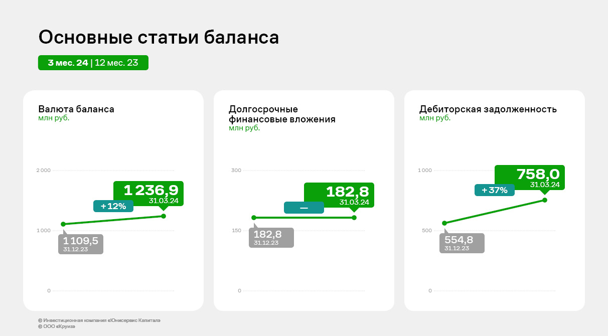 По состоянию на 31.03.2024 г. активы компании составили 1 236 млн руб., что на 11,5% выше показателей на начало года.