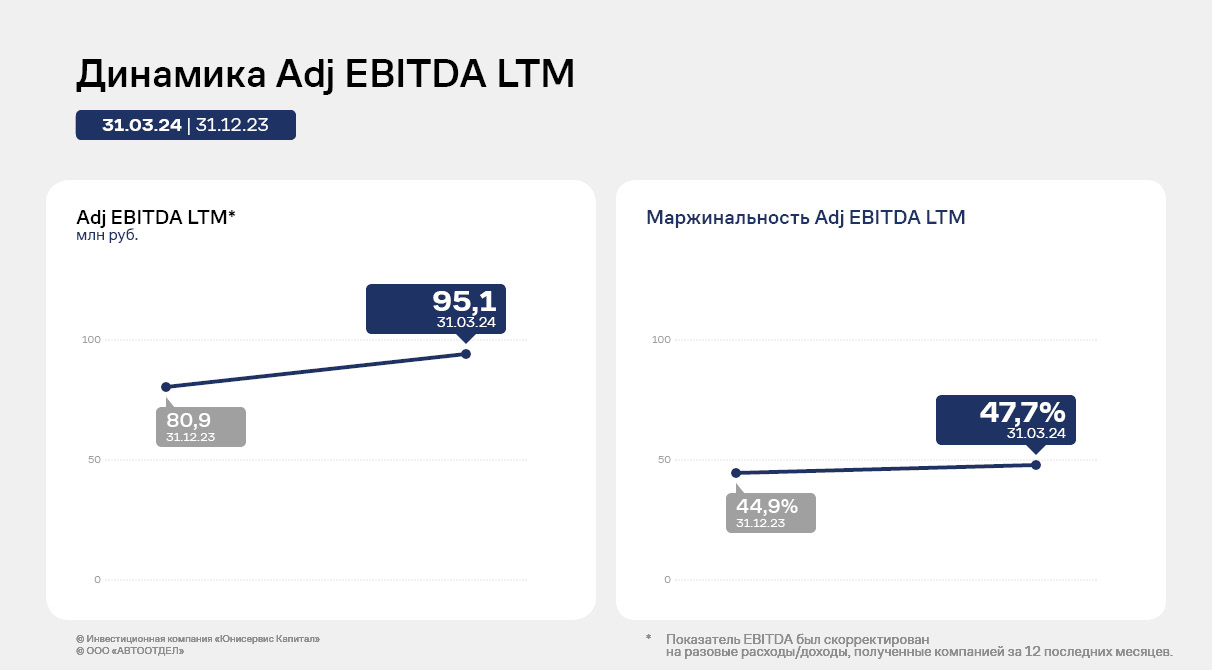 От квартала к кварталу с начала 2023 года эмитент показывал средний ежеквартальный прирост выручки на уровне 12%, а чистая прибыль увеличивалась ежеквартально более, чем на треть. Если же сравнивать 1 квартал текущего года с аналогичным периодом прошлого года, то выручка и чистая прибыль приросли кратно, последняя из которых составила по итогам работы 3 месяцев 2024 года 14,7 млн руб. (против 4,6 млн руб. годом ранее). Эффективная деятельность работы в 1 квартале 2024 года отразилась и на скорректированном показателе Adj EBITDA LTM, который достиг 95 млн руб.