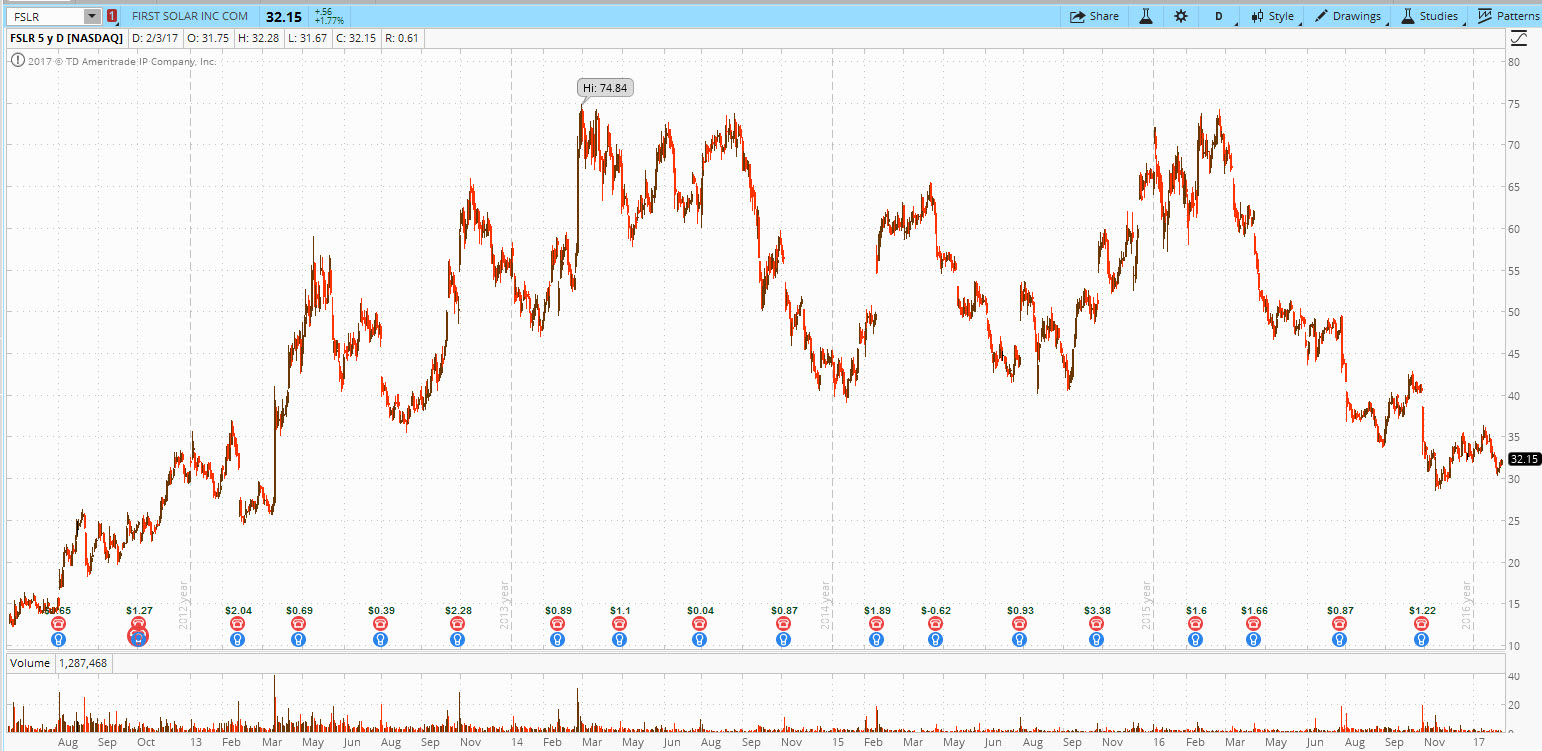 Начнем с лидера — First Solar, Inc. [FSLR:NASD]. Эта корпорация имеет рыночную капитализацию более 3,3 млрд$ и входит в индекс S&P500. Данный промышленный гигант занимается солнечной энергетикой как в США, так и по всему миру. First Solar работает в двух сегментах — компоненты и системы. В первом сегменте, компания продает солнечные модули разных модификаций. Во втором — предоставляет «под ключ» солнечные энергетические системы, включая их проектирование и разработку. First Solar, Inc была основана в 1999 году, штаб-квартира находится в Темпе, штат Аризона.