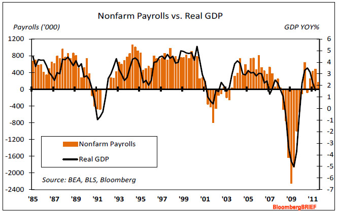 Об этом говорит график сравнения изменения ВВП от года к году и данных NFP.