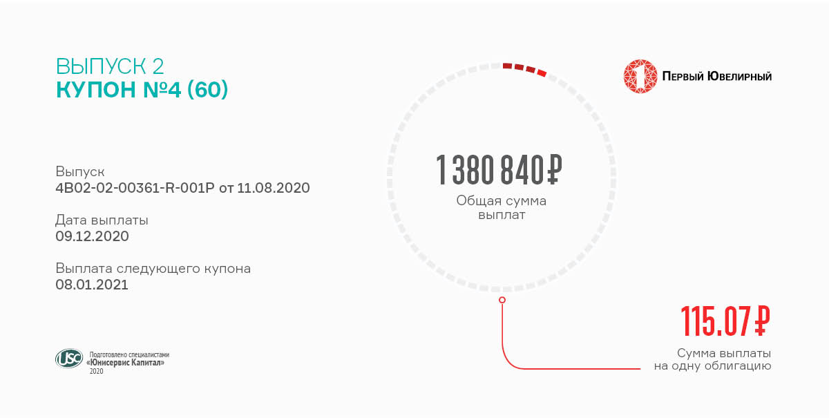Ежемесячно на выплаты облигационерам по выпуску серии БО-П02 (RU000A1020K7) компания перечисляет в НРД 1 380 840 рублей. На одну облигацию номиналом 10 тыс. приходится по 115,07 руб.