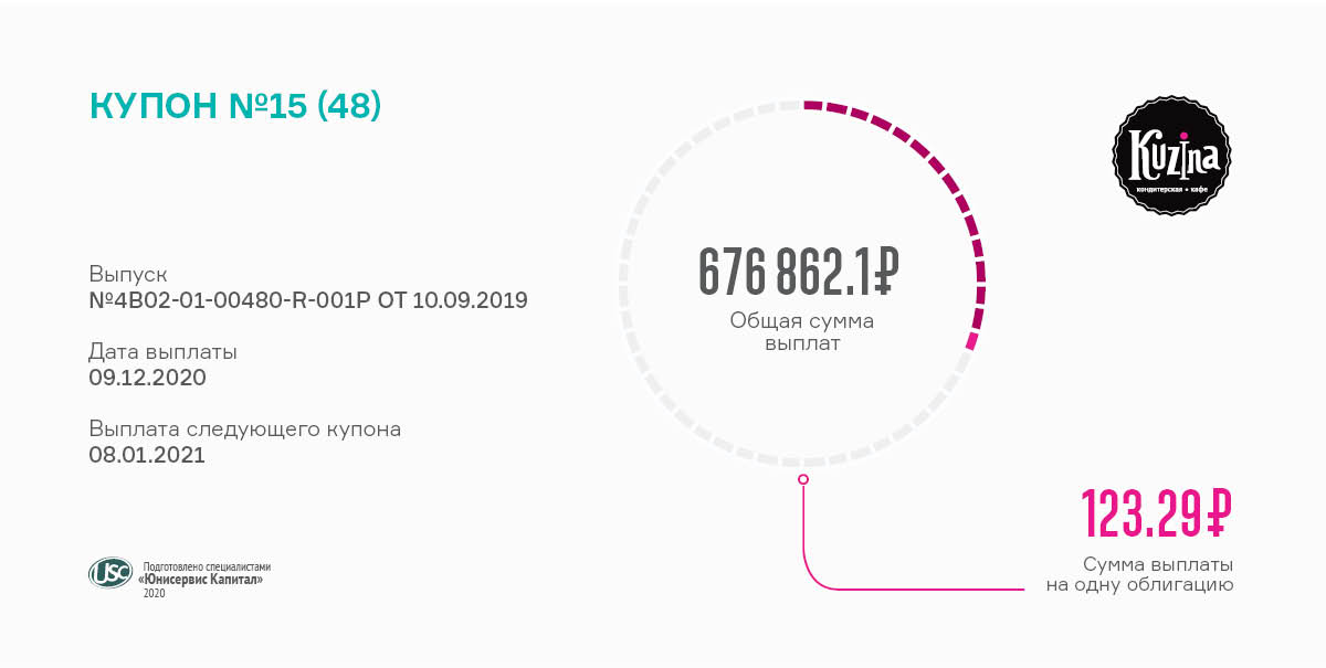 Доход инвесторов начисляется по ставке 15% годовых. Ежемесячные выплаты составляют 676 862,10 руб. за весь выпуск и 123,29 руб. в пересчете на одну облигацию номиналом 10 тыс. руб.