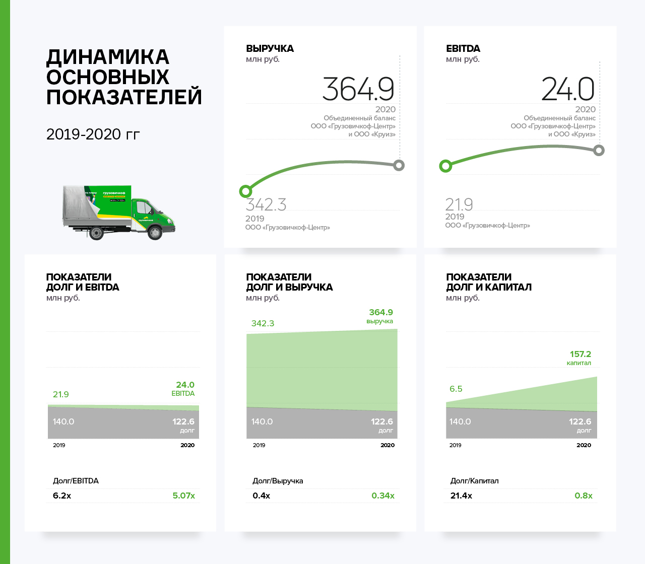 Совокупный финансовый долг ООО «Круиз» и ООО «Грузовичкоф-центр» по итогам 2020 года равен 122,6 млн руб. Совокупная процентная нагрузка по текущим долговым обязательствам составляет примерно 15,5 млн руб., что при EBITDA равной 24 млн руб. дает вполне комфортный уровень ICR (покрытие процентов операционным потоком), равный 1,55. Совокупный показатель долг / собственный капитал также имеет приемлемое значение — не больше 0,8 по итогам 2020 года.