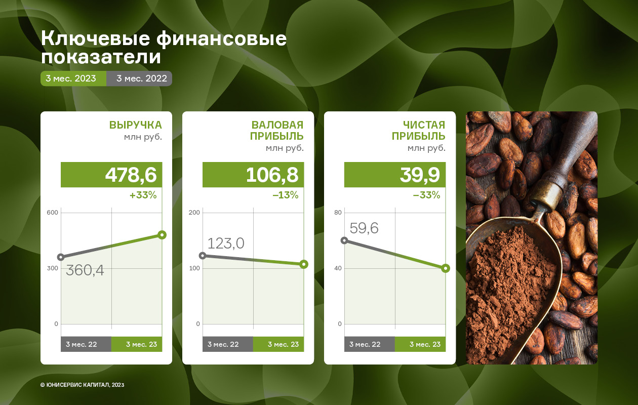 Финансирование активов компании осуществляется преимущественно за счет привлечения банковских кредитов и использования долговых инструментов. Полученные в 1 кв. 2023 года средства были направлены на пополнение оборотных средств, в первую очередь, запасов, размер которых на 31.03.2023 г. составил 293,6 млн руб., что выше значения на 31.03.2022 г. на 1,8%. Запасы какао-порошка, лимонной кислоты, кокосовой стружки, пищевых ароматизаторов и пр. составляют 52,0% активов баланса.