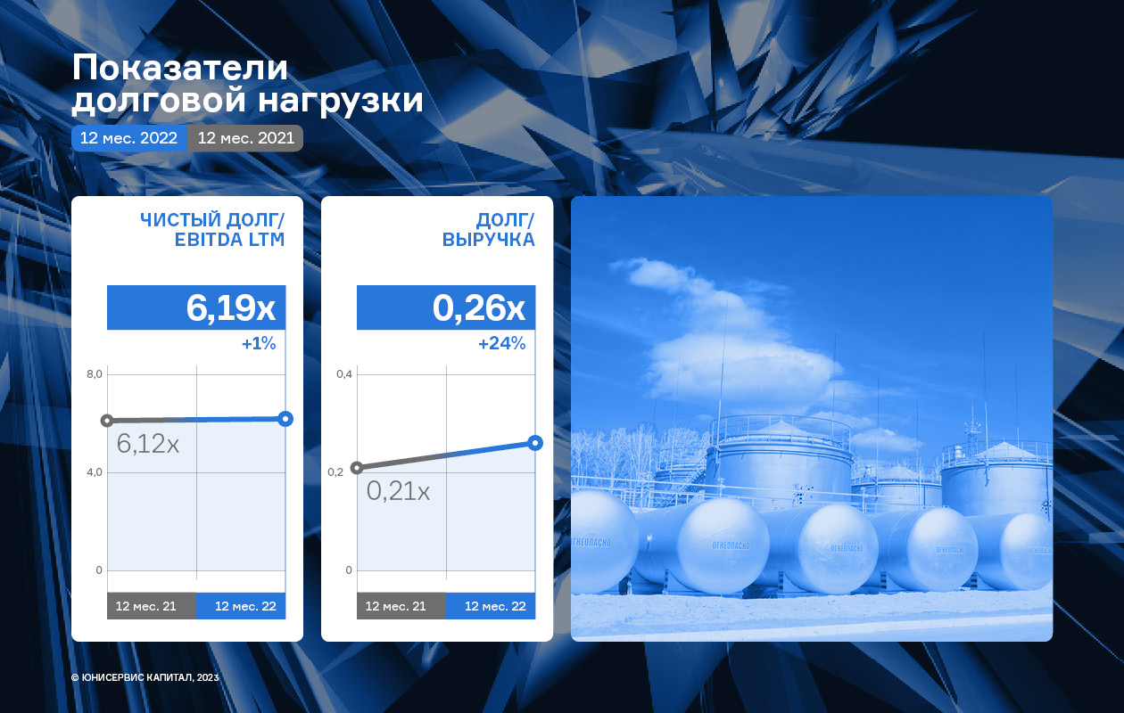 При этом, следует отметить, что соотношение долга и выручки в течение года не изменилось, его значение на 31.12.2022 г. составило 0,46, а показатель «Чистый долг/EBITDA LTM» усилил свое значение, снизившись на 3,7%.