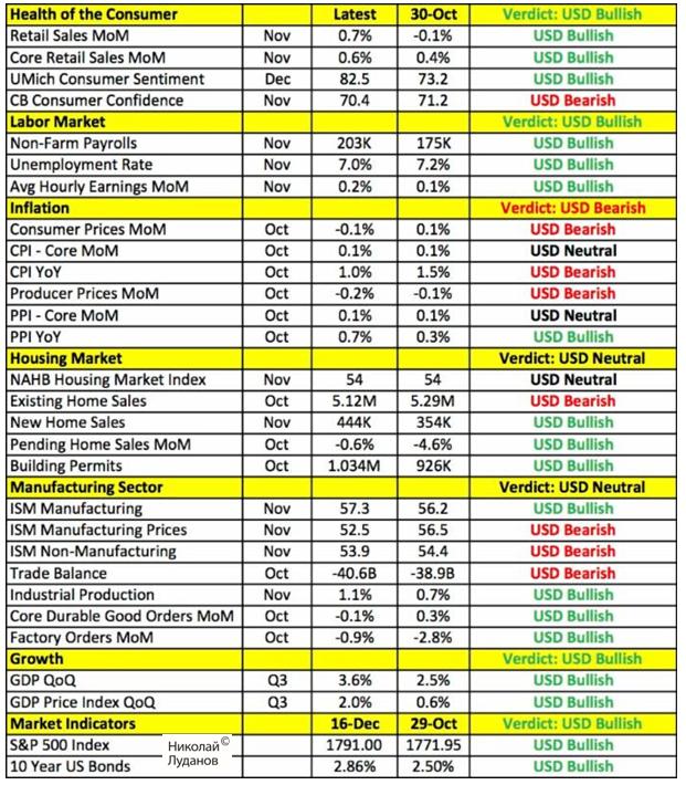 Основной темой этой недели остается заседание Комитета по открытым рынкам Федрезерва США и вопрос – начнется на этой неделе или не начнется сворачивание программы покупок активов. Взгляды на это событие очень сильно расходятся. Credit Agricole оценивает шанс taper как 1:3. Barclays считает, что taper не будет. Сводная таблица экономических данных США перед заседанием ФОМСЧтобы легче было представить, какой предстает перед членами Комитета по открытым рынкам американская экономика, Kathy Lien создала следующую табличку. В ней показано изменение основных экономических данных с момента последнего заявления ФОМС 30 октября и оценено их потенциальное влияние на американский доллар. Все данные очень сильные, и указывают на возможность taper, кроме низкой инфляции. Kathy Lien считает, что Федрезерв завтра предпримет небольшой шаг к выходу из стимулирующих мер.