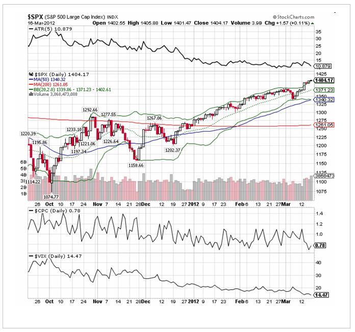 На рисунке внизу показаны индекс S&P500 и несколько индикаторов, за которыми, как вы успели заметить, я постоянно наблюдаю: put/call –коэффициент, ATR, VIX.