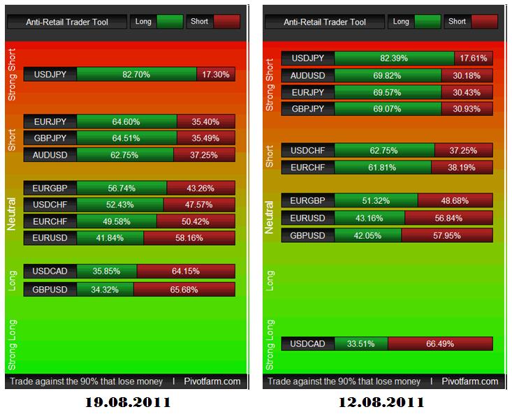 Очень давно не размещал на блоге Anti-retail Trader Tool от Pivotfarm - экзотический инструмент торговли, показывающий, как торговать против розничной толпы. ТОРГУЕМ ПРОТИВ ТЕХ 90% ТРЕЙДЕРОВ, КОТОРЫЕ ТЕРЯЮТ ДЕНЬГИ Это контриндикатор, который показывает, какие позиции занимает толпа. Если смотреть на изменения за прошедшую неделю, то сразу бросается в глаза, что толпа существенно уменьшила лонги по евро и доллару относительно франка. Теперь диспозиция здесь стала совершенно нейтральной. Anti-retail Trader Tool показывает уход от рискованных валют: AUD и CAD в направлении малорискованных: GBP и JPY. Большую часть года мы наблюдали противоположную картину. Отметим, что указатель шорта в GBPUSD даже усилился за прошедшую неделю. Британский фунт кстати был на этой неделе наиболее сильной валютой. Не рекомендовал бы использовать его для торговли, поскольку он часто запаздывает. Но дает представление об общей ситуации. В целом прошедшая неделя его подтвердила; за исключением франка. Но здесь Anti-retail Trader Tool не виноват: он неспособен учитывать валютные интервенции центробанков. Главный вывод: диспозиция Anti-retail Trader Tool указывает на уход от риска. И это подтверждает сигналы других индикаторов: US Treasuries, put/call коэффициента. Думаю, что нет смысла давать эту информацию чаще, чем через неделю. Поскольку меняется здесь все не так быстро. |