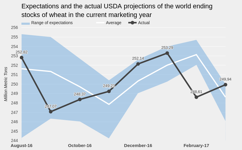 Что касается мировых балансов, USDA лишь повысило прогноза производства в Австралии на 2 млн тонн, что привело и к росту оценки конечных остатков в 16/17 МГ. Этот показатель совпал с верхним диапазоном ожиданий аналитиков, но в целом это «медвежий» фактор.