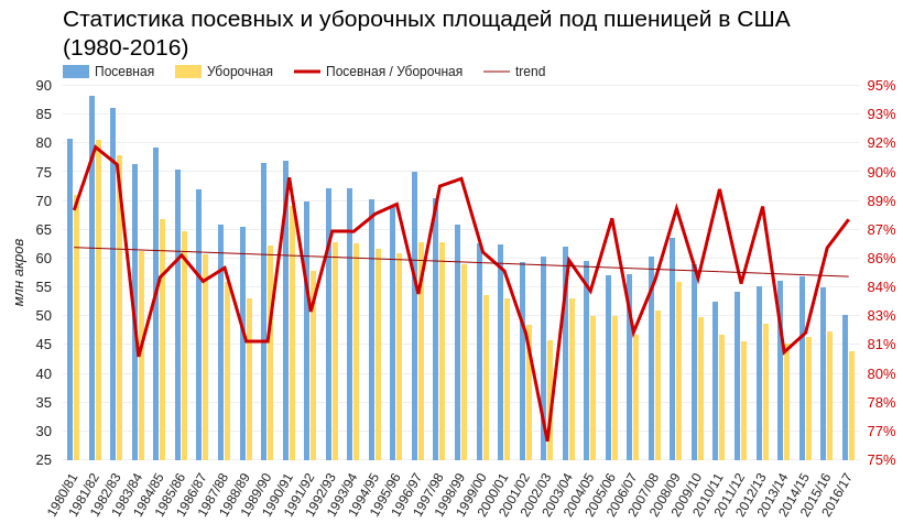 На ежегодном Outlook Forum USDA 23 февраля представило прогноз посевных площадей в США на 2017-й. Для пшеницы они составили 46 млн акров, что на 4,2 млн акров ниже финальной оценки USDA прошлого года и на 0,9 млн акров меньше ожиданий аналитиков. Эта цифра оказалась минимальной за почти столетнюю историю наблюдений. Отталкиваясь от этих данных, можно определить, какой урожай пшеницы будет в США в текущем году. С 1980-х уборочная площадь в стране в среднем составляла 85% от посевной. Значит допустим, что уборочная площадь в текущем году будет равняться 46x0,85, то есть 39,1 млн акров.