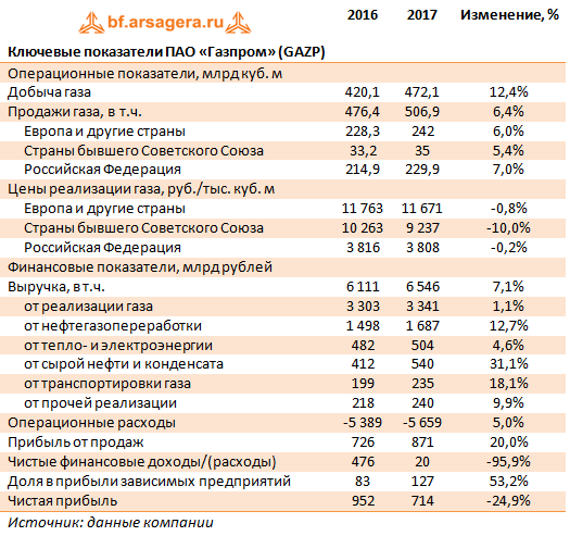 Добыча газа компанией возросла на 12,4%, достигнув 472,1 млрд куб. м. Положительную динамику демонстрировали и продажи газа: в совокупном выражении они выросли на 6,4%. Данный результат был обусловлен ростом продаж газа по всем направлениям: Европа (+6%), Страны бывшего Советского Союза (+5,4%), Российская Федерация (+7%). Стоит отметить, что Газпрому удалось превзойти высокие результаты продаж, достигнутые в 2016 году.