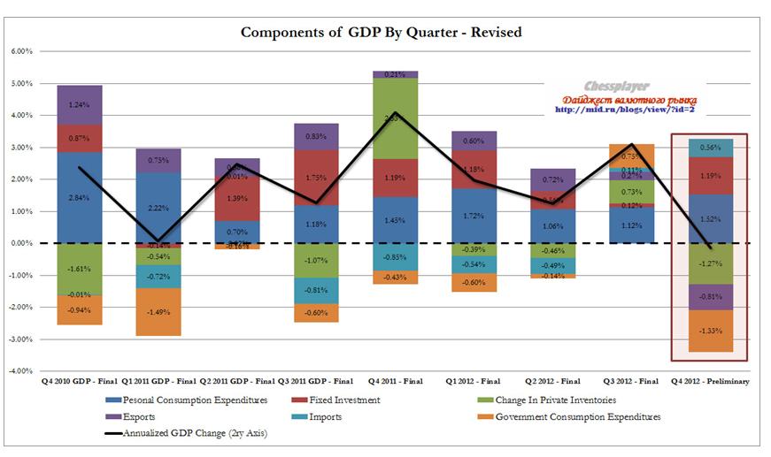 Сегодня на сайте Министерства Финансов Японии был опубликован бюджет на 2013 финансовый год (начинается в апреле месяце). Бюджет строгий, и в нем не наблюдается затрат, которые оправдывали бы хоть в какой-то мере те якобы сильные инфляционные ожидания, которые характеризует текущий завышенный курс USDJPY. Так же как и последние действия BOJ (Банка Японии). Мне последние действия BOJ, честно говоря, представляются издевательством над Абэ.А как можно воспринимать меры по стимулированию экономики, которые начинаются через год? До этого я ничего подобного ни разу не встречал. С таким же успехом их можно было принять в ноябре. Ровным счетом эти решения ничего не значат. Банкиры ему как бы говорят: ты нас все-равно в марте уволишь, мы делать ничего не будем. Итак, вербальные интервенции так и остались вербальными интервенциями. Реальных действий мы пока не видим. Теперь возникает вопрос: как долго USDJPY продержится возле уровня 91 ? Даже осторожный Николай Корженевский написал вчера: