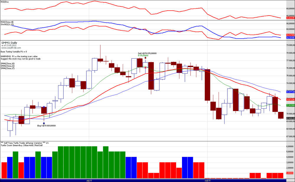 Если цены будут повышаться, то я буду покупать акции Роснефть, ГМКНорНик, ВТБ, ГАЗПРОМ, Сургнфгз, ФСК ЕЭС, РусГидро, ЛУКОЙЛ и фьючерсы RTS-06.11, ED-06.11, GMKR-06.11 по 71944, LKOH-06.11, ROSN-06.11, SBRF-06.11, VTBR-06.11. Если цены будут понижаться, то я буду продавать акции СевСт-ао и фьючерсы Eu-06.11, GOLD-06.11. Торги акциями Сбербанк и фьючерсами Si-06.11, GAZR-06.11 запрещены из-за экстремальной волатильности инструментов.