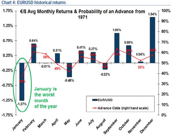Аналитик Bank of America, Macneil Curry, считает, что 2014 год будет интересен медведям по евродоллару. Исторически январь самый слабый месяц в году. Данные были взяты с 1971 года (с интерполяцией, фактические данные взяты с 1999 года). Средний показатель доходности января за эти годы составил — 1,27%. В 62% случаев евро снижался в январе.