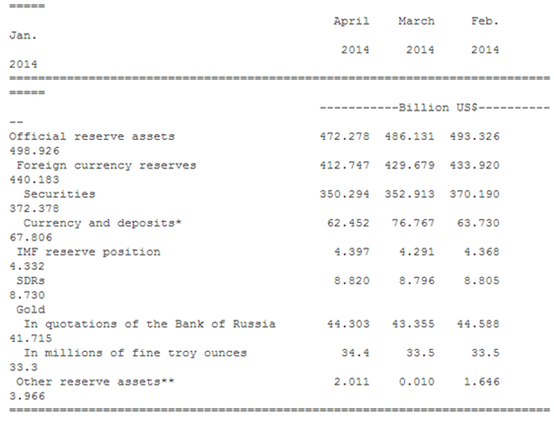 Что же покупали на вырученные деньги? Прежде всего, золото. Центробанк России увеличил свои вложения в золото на 900 тыс. унций или на 1,17 млрд. долларов в апреле этого года. Общие резервы в золоте составили на апрель 34,4 млн. тройских унций. Общая сумма вложений в золоте на 1 мая составляла 44,30 млрд. долларов. Общий срез золотовалютных резервов за апрель по данным Bloomberg был такой.