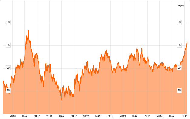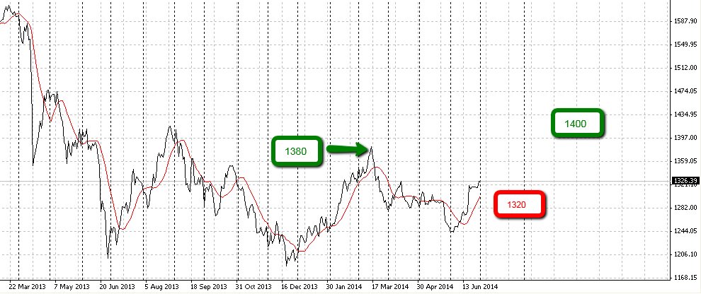 Уровень в 1290 дол. за тройскую унцию стал локальным минимумом. Вчера цена пробила важный психологический уровень в 1300 долларов за унцию и сейчас золото торгуется по 1304 дол. От уровня 1300 хорошая точка для входа в краткосрочную длинную позицию. Целевым уровнем может служить уровень 1350 дол. Вероятно, мы наблюдаем разворот золота после падения в 2013 году. Для долгосрочных инвесторов, таких как Марк Фабер, золото стало еще более привлекательным. Внешний фон так же добавляет аргументов для держателей золота. Повсеместно в мире растет военное напряжение — Украина, Израиль, Ирак и Сирия. Так же важным дестабилизирующим фактором можно считать фактически начало торговой войны между Западом и Россией. Санкции и ответные санкции все чаще появляются на арене. А это плохо для всех сторон конфликта.