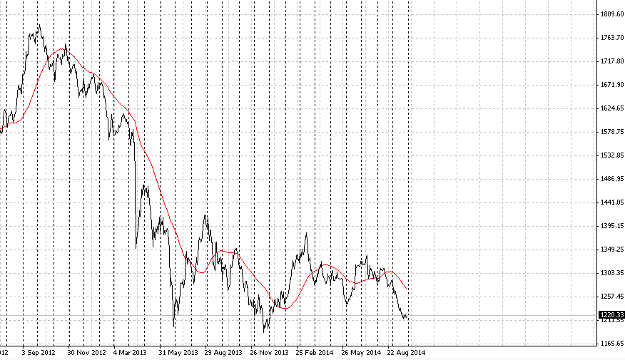 Очередной минимум с 2013 года золото демонстрирует. Падение золота с максимумов 2011 года замедлилось. Боковая динамика с мая 2013 года продолжается и это может быть признаком локального дна. Вероятно сейчас хороший момент для в хода в золотой металл.