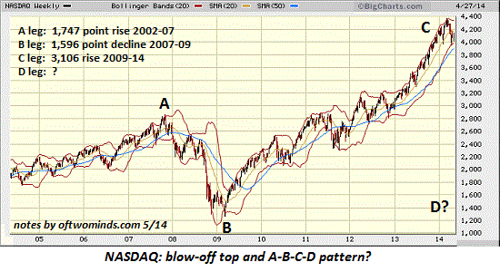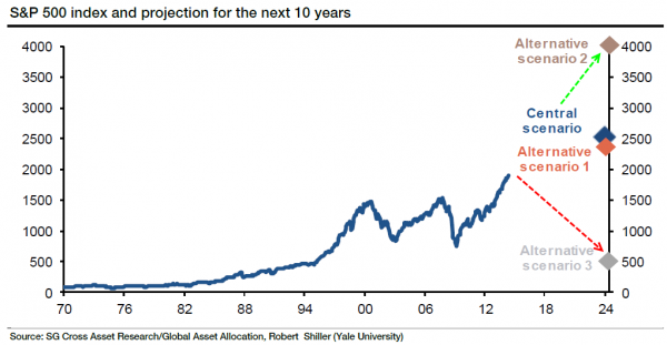 Один из крупнейший французских финансовых конгломератов (активы более 1 трлн. долларов) дал свой прогноз на 10 лет. Согласно мнению аналитиков французского банка циклически скорректированная оценка американского рынка показывает очень высокий уровень капитализации. После пяти лет роста с 2009 года вероятность возникновения рецессии в прогнозируемый период (10 лет) равна 100%. Рецессия в среднем приводит к падению прибылей на 22%. За последние несколько кризисов падения прибылей было все более сильным в моменты рецессии.