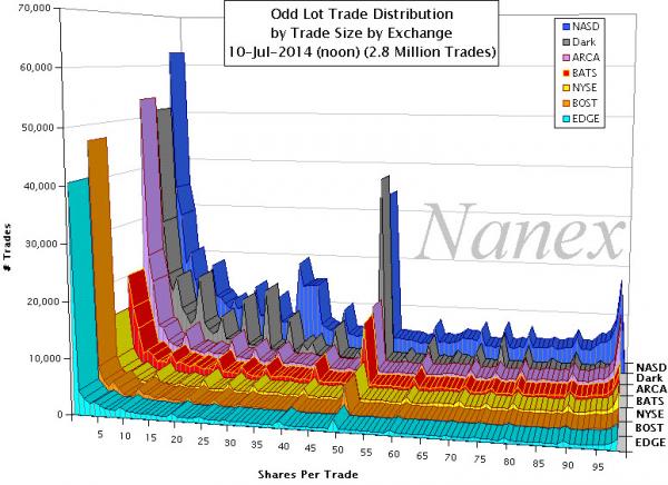 Часто раздаются споры о роли HFT в современных торгах. Насколько сильно влияние высокоскоростных алгоритмов в торгах на биржах и дарк-пулах? Многие аналитики говорят о слишком большой концентрации внимания на HFT алгоритмах. С другой стороны есть статистика об увеличении доли высокоскоростных алгоритмов в общем объеме торгов. Есть подозрения, что засилье HFT не благо для инвестора в виде большей мгновенной ликвидности. А это наказание в виде алгоритмов, которые могут фронтранить приказы других участников, другими словами кормится за счет этих приказов, ухудшая реальную цену приказа. Так или иначе, роль роботов велика и это явно видно по структуре торгов в разрезе лотов.