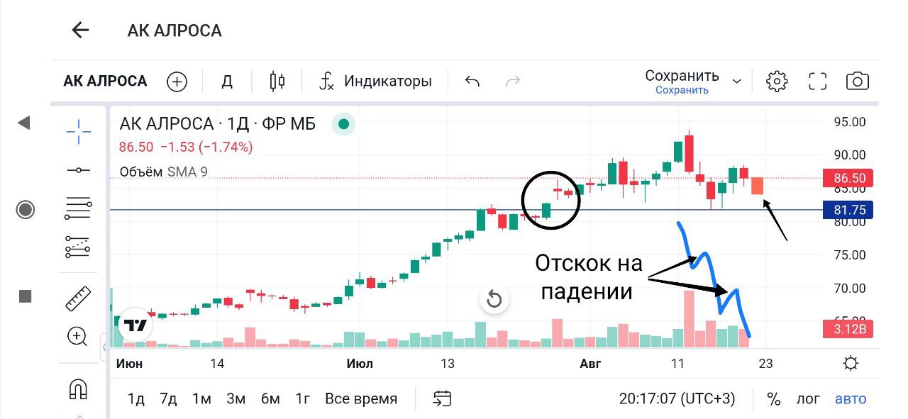 🍋Далее мы получили слом движения и даже подтверждение слома второй ростовой свечой, но вчера на сильном рынке в бумаге вновь началась слабость. В чëм причина, знать не могу! Инсайд ли это по мелким дивам или их не выплате, я не знаю. Могу лишь порассуждать на тему того, что говорит график. А график нам говорит, что у нас очередной день икс, на этот раз в Алросе. Если сегодня будет формироваться растущая свеча, это будет указывать, что ранее слом движения был разворотным, снижение было связано с поиском баланса в бумаге после двух активных дней роста и формируется повышенная вероятность на продолжение ростового движения с походом на штурм локального хая.