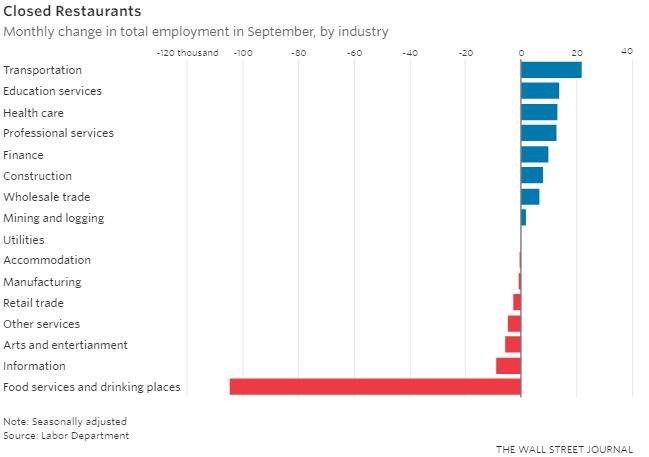 Статистика – дама своенравная и весьма гибкая, так и норовит чего-нибудь соврать. Ещё в пятницу встречал множество заголовков, каким образом BLS (Бюро трудовой занятости) “подгонял” цифры, чтобы учесть искажения, которые “принесли” ураганы Ирма и Харви. На первый взгляд всё просто – в основном закрывались бары/рестораны в штатах Флорида и Техас, соответственно эта отрасль и потеряла около 105 тысяч рабочих мест:
