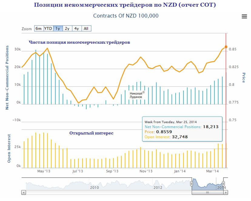 Чистая длинная позиция некоммерческих трейдеров в NZD растет 6 недель подряд и достигла уровня мая 2013 года. При этом открытый интерес (число открытых контрактов) относительно стабилен, но значительно ниже, чем был в мае (примерно на 30%).