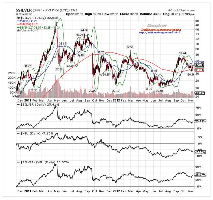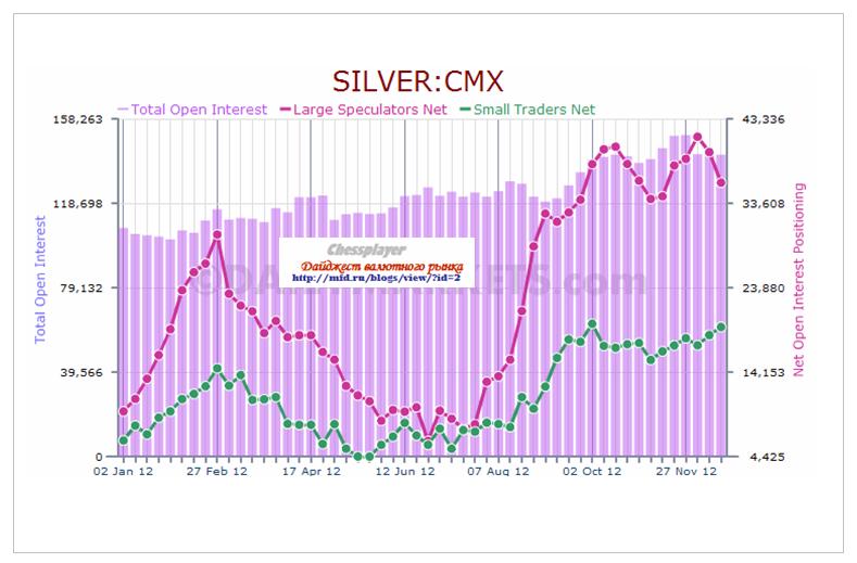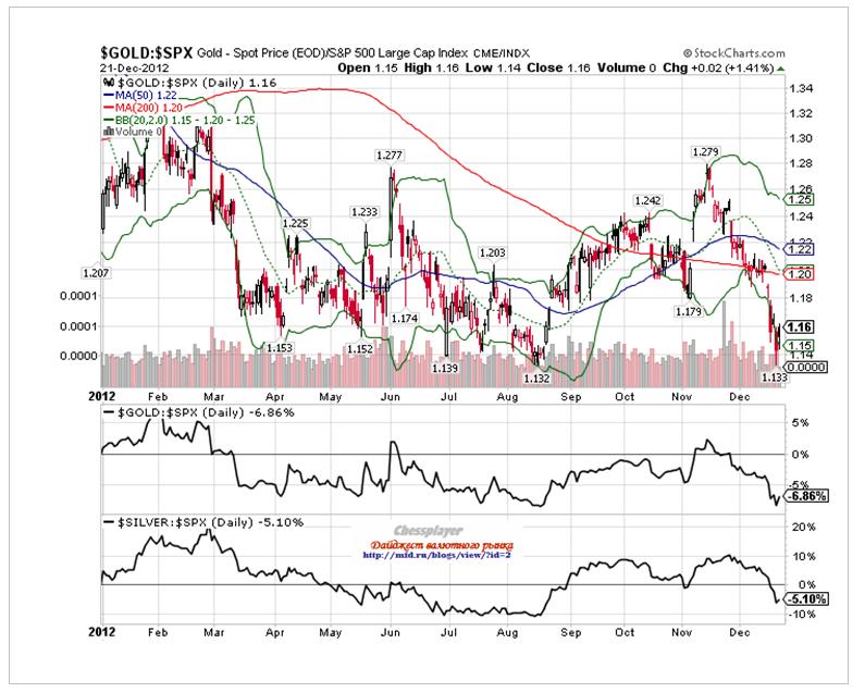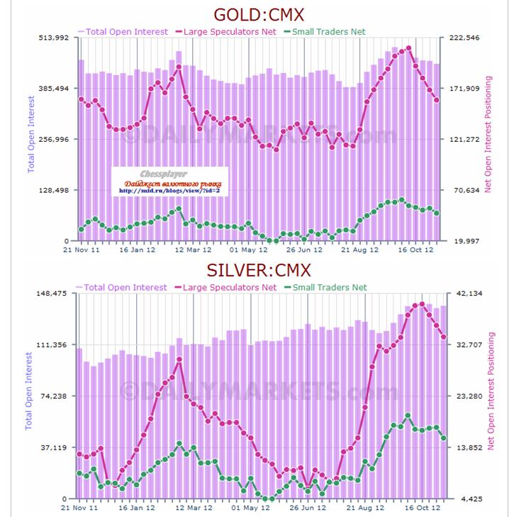 Ситуацию я оцениваю, как совершенно нейтральную. Позиция по EURO/USD оправданна с точки зрения наступающего «фискального обрыва». Она также оправданна с той точки зрения, что ФРС уже отстрелялся с мерами стимулирования экономики, а для ЕЦБ как раз настает момент предпринимать что-то новое. В то же время она совсем не оправдана с точки зрения позиций розничных клиентов.Соотношение лонг/шорт=30/70 в рознице – в пользу EURO, но полагаю, что это не способно остановить его снижение. Почти такое же соотношение пару дней назад было в AUD. Сейчас лонг/шорт=50/50, и где сейчас курс AUD/USD? Розничные клиенты тоже иногда выигрывают. Хотя у меня достаточно сильная уверенность, что EURO/USD направится вниз в ближайшие дни, на всякий случай шорт по EURO/USD я хеджирую лонгами по GOLD и SILVER. У меня есть своя версия их снижения, о которой речь пойдет в конце статьи. Ожидаю, что золото и серебро в январе вернут большую часть потерь.Таким образом, у меня получаются синтетические лонги GOLD/EURO и SILVER/EURO. Об этих позициях речь пойдет ниже. Стратегия торговли:Реакция рынка на последнее заседание Комитета по открытым рынкам ввела меня в заблуждение, а ралли по поводу каждой мало-мальски позитивной новости относительно «фискального обрыва» привели к тому, что у меня накопилось много шорта по EURO/USD, открытого в диапазоне 1,30-1,315. Ввиду того, что ночью с четверга на пятницу окончательно стало ясно, что «фискальный обрыв» по меньшей мере до середины января не разрешится, снижение EURO/USD практически неизбежно. Я планирую постепенно закрывать свой шорт при движении вниз, и продавать при отскоках, которых наверняка будет много. Однако диспозиция розницы меня настолько сильно беспокоила, что я практически весь шорт по EURO/USD превратил в лонги по GOLD/EURO и SILVER/EURO.Падение в три сигмы и соображения по поводу падения драгоценных металлов дают основание открыть лонги по драгоценным металлам против EURO. В принципе драгоценные металлы можно было и так покупать - о причинах последнего падения GOLD и SILVER в конце статьи. Третья моя крупная позиция: шорт по EURO/GBPЭта позиция противоречит моему среднесрочному прогнозу по EURO/GBP – движение к 0,83. Но здесь несколько изменилась ситуация. Доводы в пользу шорта по EURO/GBPМонетарная позиция ЕЦБ в настоящий момент кажется мне мягче, чем Банка Англии. На последнем заседании ЕЦБ шло широкое обсуждение возможности понижения банком ставки, в то же время высокая инфляция не дает Банку Англии приступить к новой программе покупок активов. Второй довод – RISK OFF. Эти два довода предопределяют мою короткую позицию по EURO/GBP. С другой стороны, с точки зрения последнего отчета COT EURO выглядит лучше чем GBP. Мне это не нравится, и я подумаю насчет сохранения позиции в EURO/GBP.В принципе, шорт EURO/USD предполагает шорт EURO/GBP. Между ними такая корреляция. Стратегия торговли:Я не рассчитываю на рост волатильности в паре EURO/GBP. Такое происходит как правило во время принятия каких-то важных решений центральными банками. Я также не рассчитывают на существенный отход от текущих уровней. Скорее всего, EURO/GBP не пойдет существенно ниже уровня 0,81. Не вижу и перспектив движения выше 0,82. В этом диапазоне я планирую торговать EURO/GBP от шорта лесенкой с шагом порядка 15 пунктов.GBP/USDУ меня был также шорт по GBP/USD, который я почти полностью закрыл в пятницу из-за очень сильного движения в мою пользу. В начале недели полагаю, ч