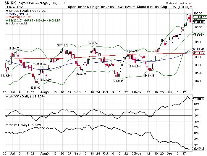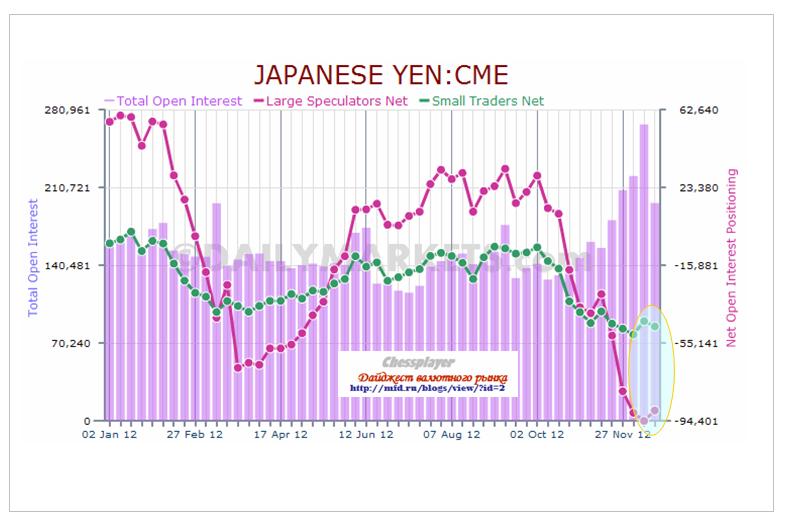 Фьючерсный рынок США – это конечно не то место, где определяется курс валют, но, тем не менее, нельзя сбрасывать со счетов этот сигнал.Я рассматриваю круглый уровень 85 как определенный потолок для курса USD/JPY. Полагаю, что до 26 декабря давление покупателей в USD/JPY сохранится и пара будет ходить вместе с RORO (RISK ON/RISK OFF). Моя оценка RORO на ближайшие дни-недели: сильный RISK OFF до того момента, пока не будет достигнут прогресс в вопросе «фискального обрыва».RISK ON = USD/JPY вверх RISK OFF = USD/JPY вниз 26 декабря соберется на первое заседание новое японское правительство. До этого момента у быков не должно хватить сил пробить 85, но и медведи едва ли будут переходить в решительное наступление. Примерный диапазон, который я вижу по USD/JPY=83,5 – 84,7. После заседания правительства возможна коррекция USD/JPY в район 82, или даже ниже.Фундаментальные соображения по японской йенеРынок заложил в курс USD/JPY значительный риск, что Абэ что-нибудь «учудит». Первые же недели работы правительства покажут, что страхи рынка преувеличены. С парламентскими выборами в Японии и страхами серьезных изменений совпало, что ситуация в еврозоне разрядилась и поток японской йены устремился в EURO. В этот момент оказались выгодные объекты инвестиций. НО сейчас доходности периферийных европейских долговых бумаг на двухлетних минимумах и другие EURO-активы стоят относительно дорого. Федрезерв запустил две новые программы QE и будет в новом году вкачивать в финансовую систему по 85 млрд. долларов ежемесячно. USD – тоже не подарок. Так что огромному потоку японского капитала по существу некуда мигрировать. Кроме того, я полагаю, что японские инвесторы рынка облигаций взбешены и окажут давление на японское правительство. Об этом факторе подробно в конце статьи. Существует и другой вариант, что если Абэ не будет предпринимать слишком радикальных мер, то к JPY вернется статус безопасной гавани капитала. В этом случае в первом квартале 2012 года JPY может опуститься ниже 80.Другой серьезный аргумент в пользу лонга по японской йене – сильная перекупленность NIKKEY.Японская йена и NIKKEY двигаются практически синхронно, только в разных направлениях. Это апофеоз монетарной политики – цены на активы определяются исключительно операциями ЦБ на открытом рынке.Большую часть времени JPY ведет NIKKEY. Но перекупленность NIKKEY будет серьезно тормозить дальнейший рост. На двух дополнительных графиках хорошо видно, насколько сильно коррелируют JPY и NIKKEY. Резюме:Аргументы в пользу снижения USD/JPY – RISK OFF, технические факторы (перекупленность USD/JPY и NIKKEY), COT-отчет, отсутствие выгодных объектов вложения для такого большого объема капитала. Еще один, может быть самый сильный аргумент, вы найдете в конце статьи.Аргументы в пользу роста USD/JPY – Абэ переходит от слов к решительным действиям. Учитывая тот огромный ущерб, которые наносят его действия финансовому сектору Японии (банки, страховые компании, пенсионные фонды) ожидаю, что действия окажутся гораздо более осторожными, чем слова. ИМХО, для дальнейшего роста JPY необходим решительный перелом в мировоззрении японских институциональных инвесторов. Это чревато для финансовой системы Японии и этого не будет. В краткосрочном и среднесрочном плане (ближайшие два месяца) полагаю, что вероятность закрепления USD/JPY выше 85 очень мала. Стратегия торговли:Лесенкой продаю и откупаю USD/JPY и EURO/JPY че
