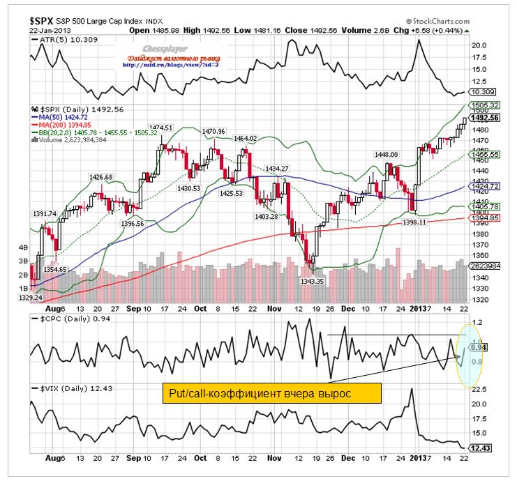 Вчерашний день на американском фондовом рынке завершился относительно нейтрально: - 0,17% при маленьком торговом диапазоне. Несмотря на столь ничем невыразительный результат мы увидели серьезный сдвиг в настроениях опционных трейдеров – put/call-коэффициент вырос с 0,8 до 1,04 (медвежье значение), и рост VIX.