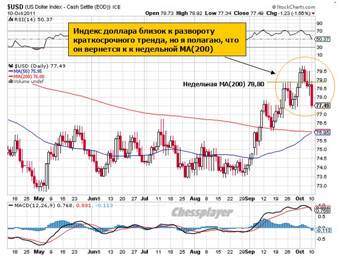 Коррекция в индексе доллара уже развилась почти до разворота краткосрочного тренда. Фундаментальные основания для этого: улучшение долларовой ликвидности, уменьшение интенсивности продаж активов с целью избежать дефолта европейскими банками, коррекция в US Treasuries, вызванная главным образом продажами со стороны суверенов для проведения валютных интервенций с целью остановить рост доллара. Мне известно по меньшей мере, что такие интервенции провели Россия и Бразилия.